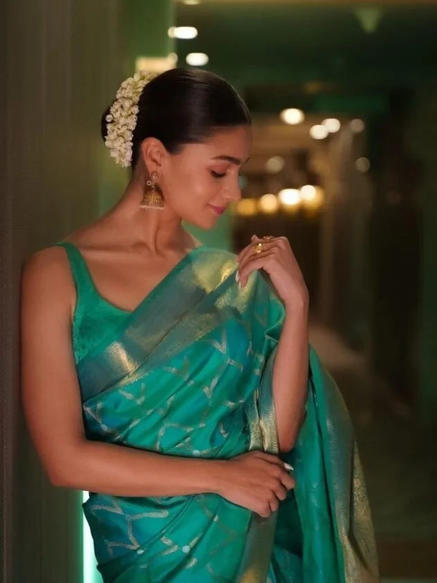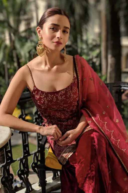 Her choice of fabrics, rich embroidery, and contemporary cuts often make her outfits stand out at events and festivals. She skillfully pairs traditional pieces with statement jewelry and stylish accessories, creating a perfect balance between classic charm and modern flair. Alia’s ethnic looks inspire many, making her a trendsetter in the world of fashion.