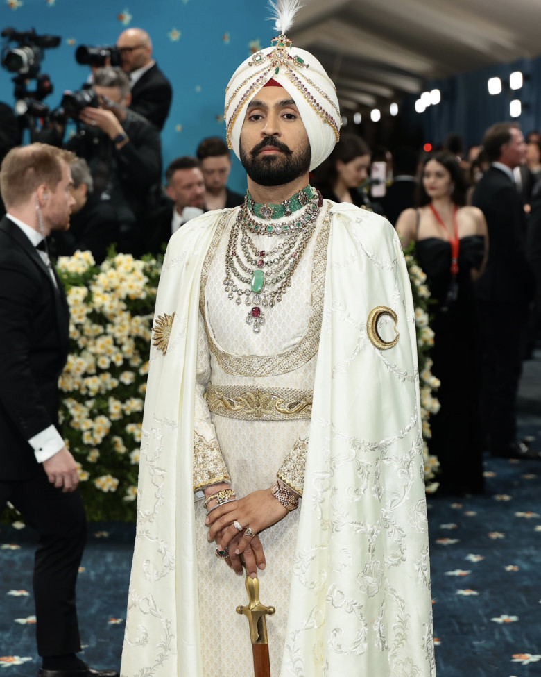 At the Met Gala 2025, the Amar Singh Chamkila actor looked stunning in an all-white ensemble with a traditional turban on top, exuding regal elegance. He proudly reflected his background by elevating his ensemble with symbolic sword and elaborate jewellery.