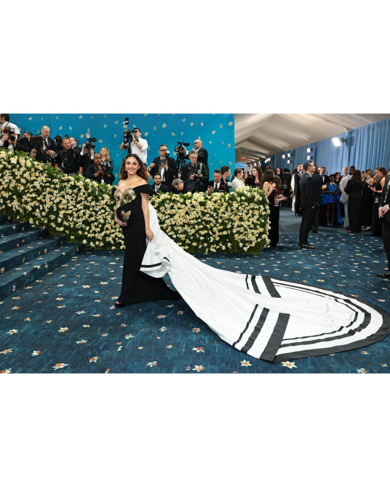 Expectant mother Kiara made her Met Gala debut wearing a custom Gaurav Gupta gown, a breathtaking black gown with a metallic breastplate and a sweeping white train, styled by the famous Anaita Shroff Adajania.